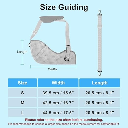 Choosing the right arm sling is very important for fixing the arm and preventing future injuries; Please refer to the size chart for an accurate fit; Suitable for left and right hands, suitable for children, adults, the elderly, men and women.
